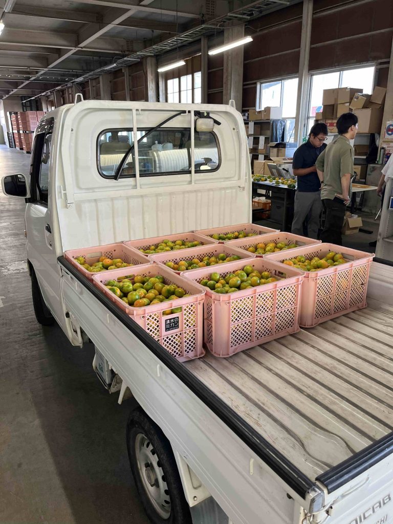 次々とミカン農家から柑橘共選場へゆら早生ミカンが運ばれていきます。