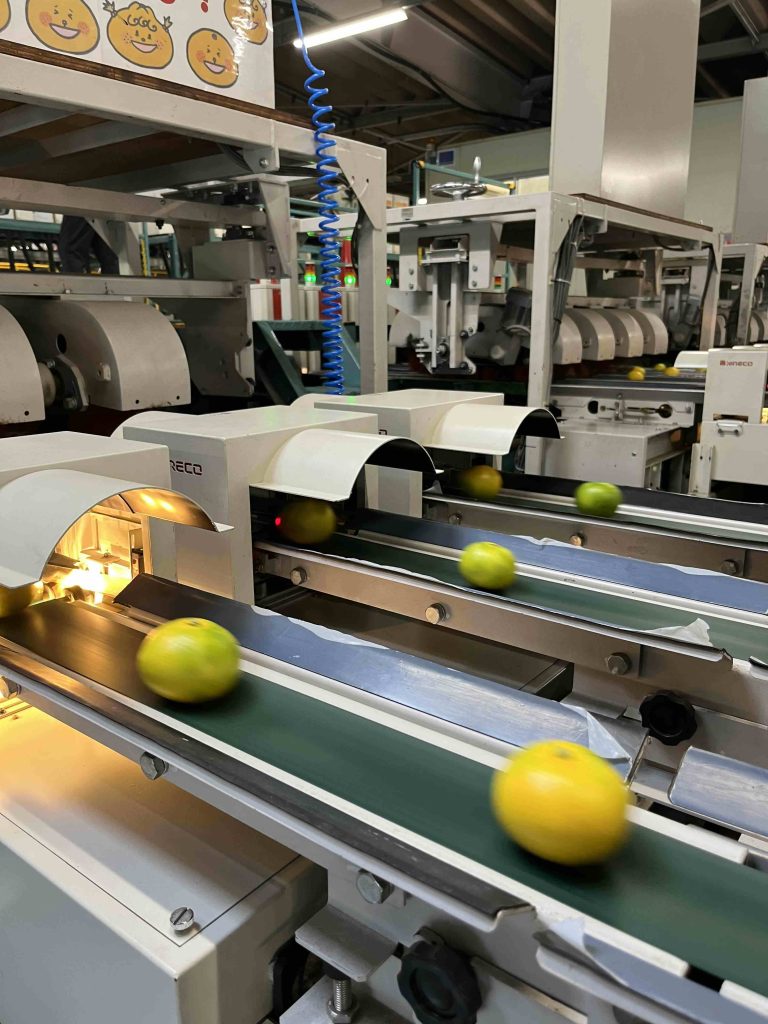 機械センサーを通過するゆら早生ミカン。品質(味、大きさ)で等級別に仕分けられます。