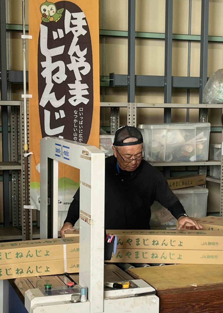 ⇒ほんやま自然薯の封詰めを行うJA静岡市ほんやま自然薯部会 藤田部会長。イチオシの食べ方は、やっぱり「とろろ汁」