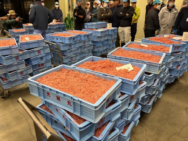 強風等により6日ほど遅れて始まった秋漁ですが、初日は由比漁港、大井川港合わせて2.3トン(昨年秋と同等)の水揚げがあり、由比漁港の1カゴ(15kg)あたりの平均価格は8万3,862円(昨年秋より8,812円高い)となりました。