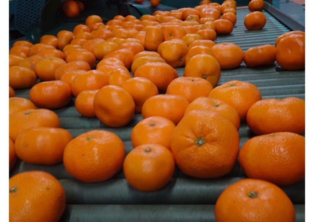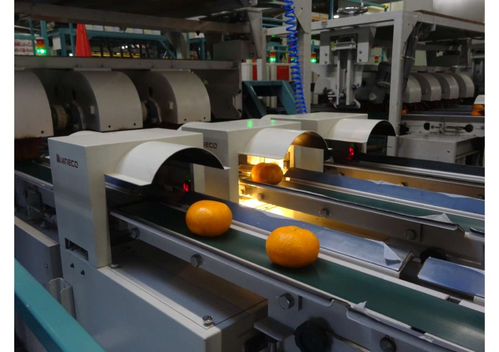 検査員の検査を通過したみかんは機械センサーを通過し、品質(味、大きさ)で等級別に仕分けられます。